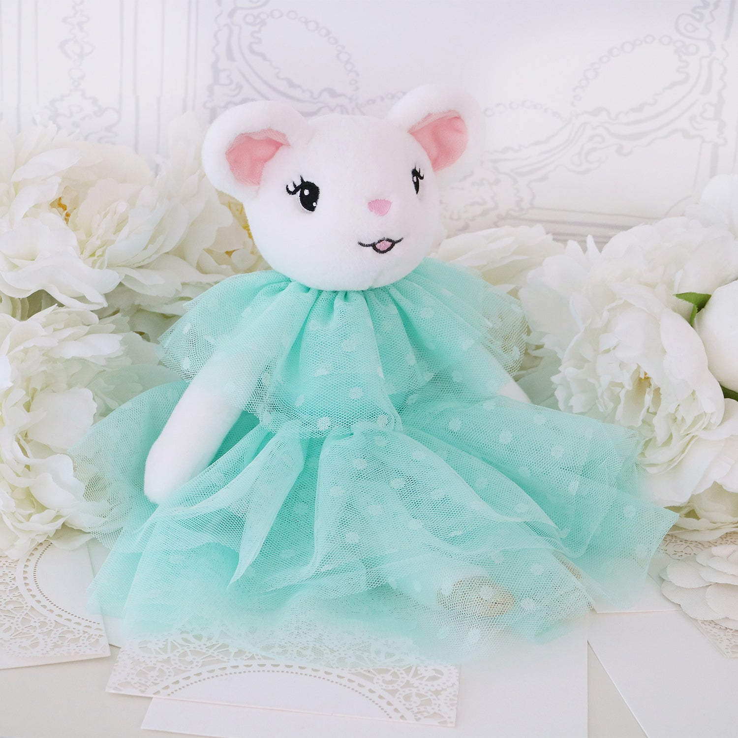 - Claris plush features gold shoes and deluxe soft tulle turquoise dress